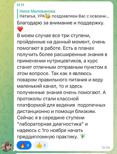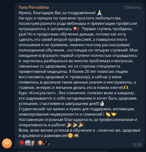 Дипломированный нутрициолог — в 2006 году получила диплом международного образца IES, London, веду частную практику по сей день.